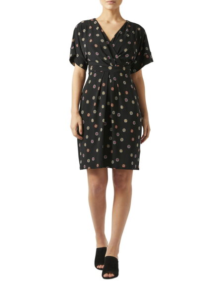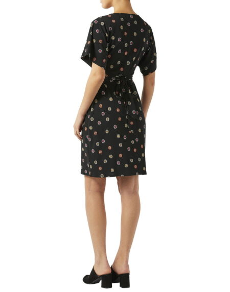 A vibrant saffron wrap dress adorned with a delicate floral print, perfect for sunny days and casual outings.