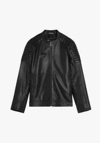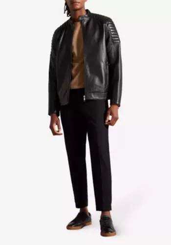 Leather jacket with bold padded-shoulder design.