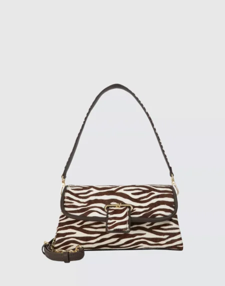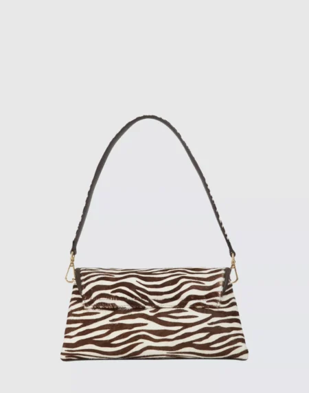 A bold leather shoulder bag with a striking zebra pattern, a sleek shape, and an adjustable strap for easy day-to-night styling.