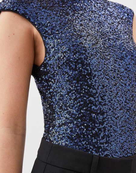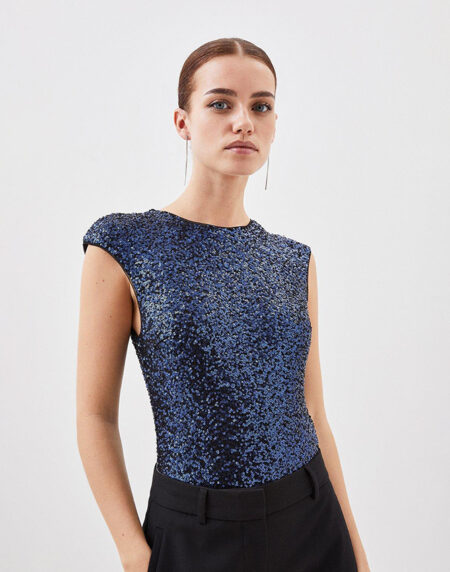 The Karen Millen Petite Stretch Sequin Backless Bodysuit features a flattering fit and bold sequin details, with a backless design perfect for a night out.
