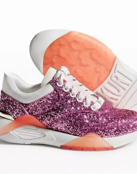 Iris trainers in pink glitter, combining sparkle with comfort for a standout look.
