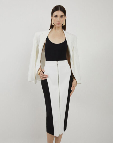 The midaxi skirt combines bold colour-block panels with a tailored fit, offering a flattering and stylish addition to any wardrobe.