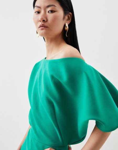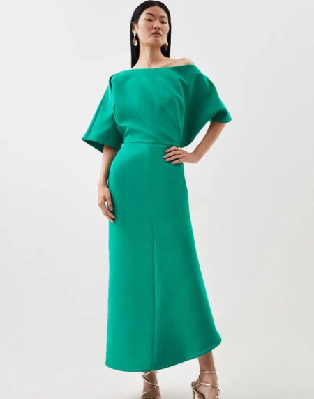 This midi dress combines contemporary design with timeless elegance, featuring a structured fit and flattering off-shoulder neckline.