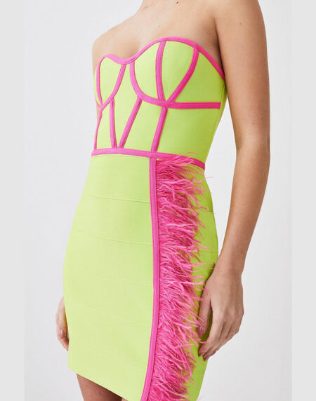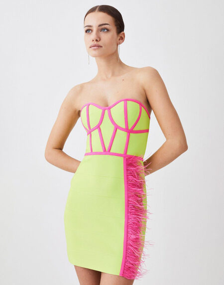 Turn heads with the Bandage Feather Detail Mini Dress, a stunning fusion of sultry sophistication and bold elegance. Its figure-hugging design and feather accents make it perfect for standout moments.