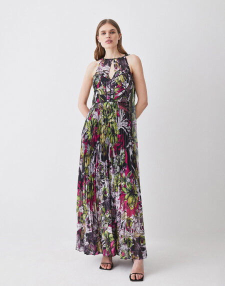 This maxi dress offers a flattering corset design with a floral print and pleated skirt, perfect for an elegant, feminine look.