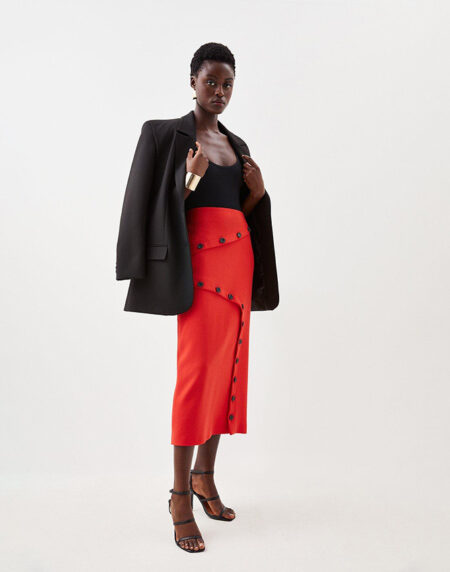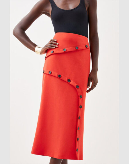 (0)Compact Stretch Asymmetric Button Midi Skirt