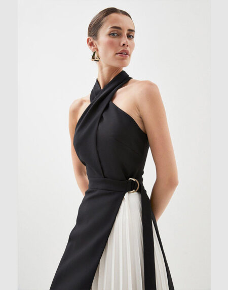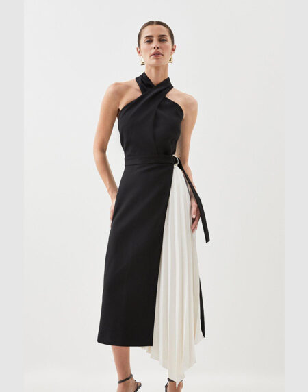 This midi dress features a flattering halter neckline and elegant pleating, offering a chic and timeless look perfect for any occasion.