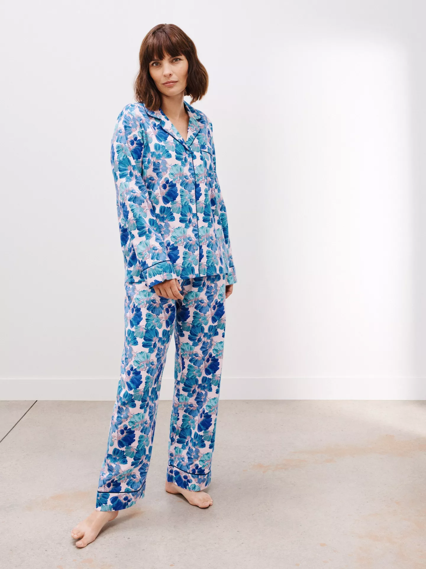 This floral cotton pyjama set offers lightweight comfort for restful nights. The natural cotton fabric feels soft and breathable, while the print adds a classic touch. Ideal for year-round sleep and lounging.