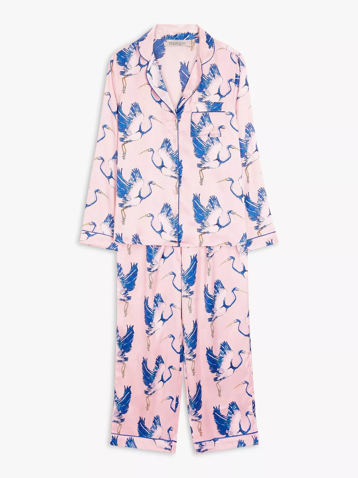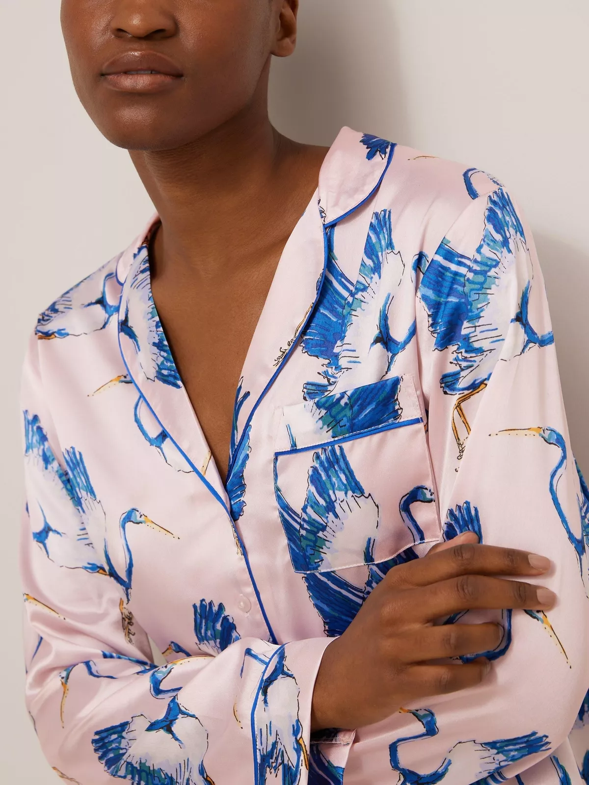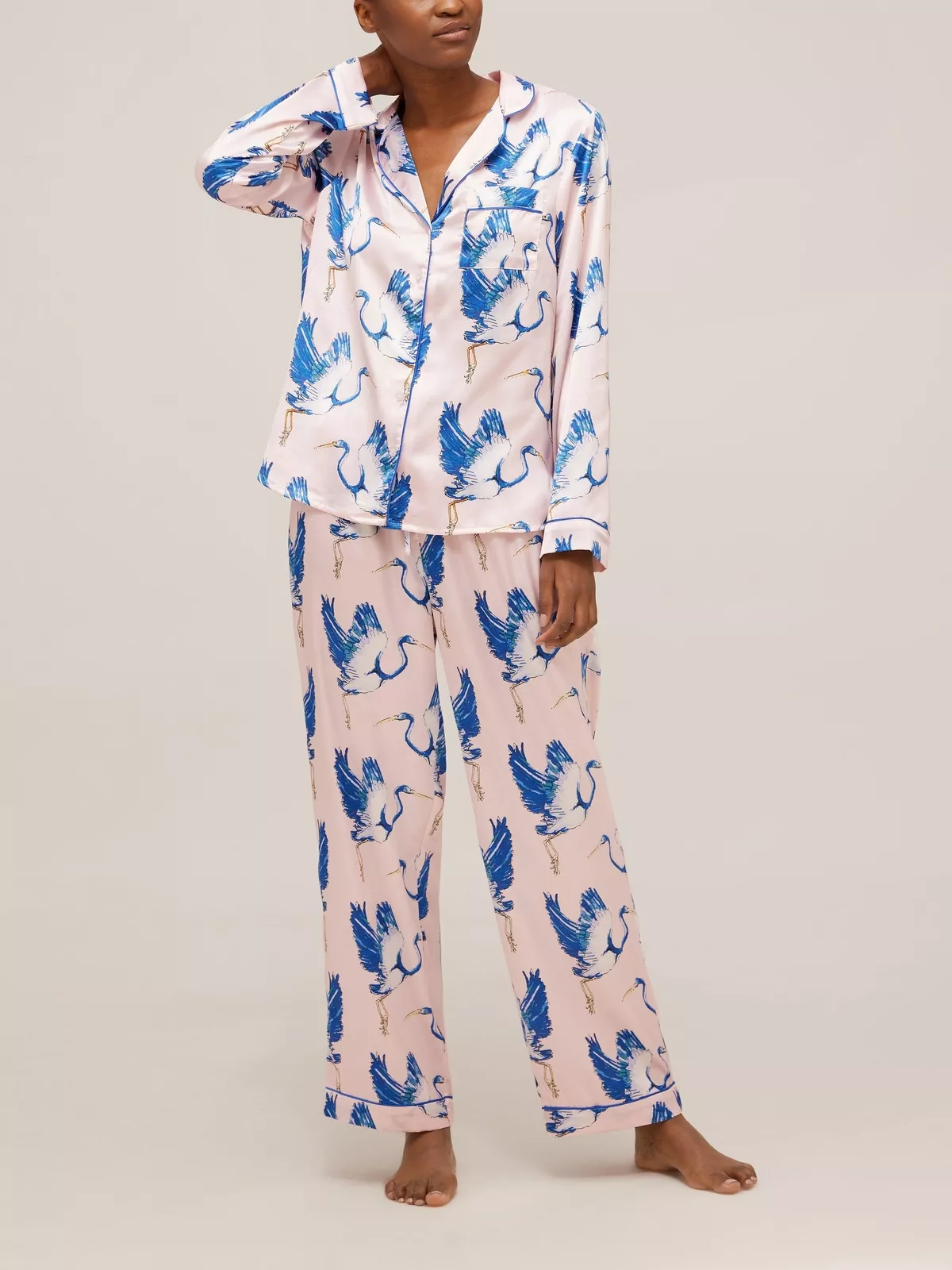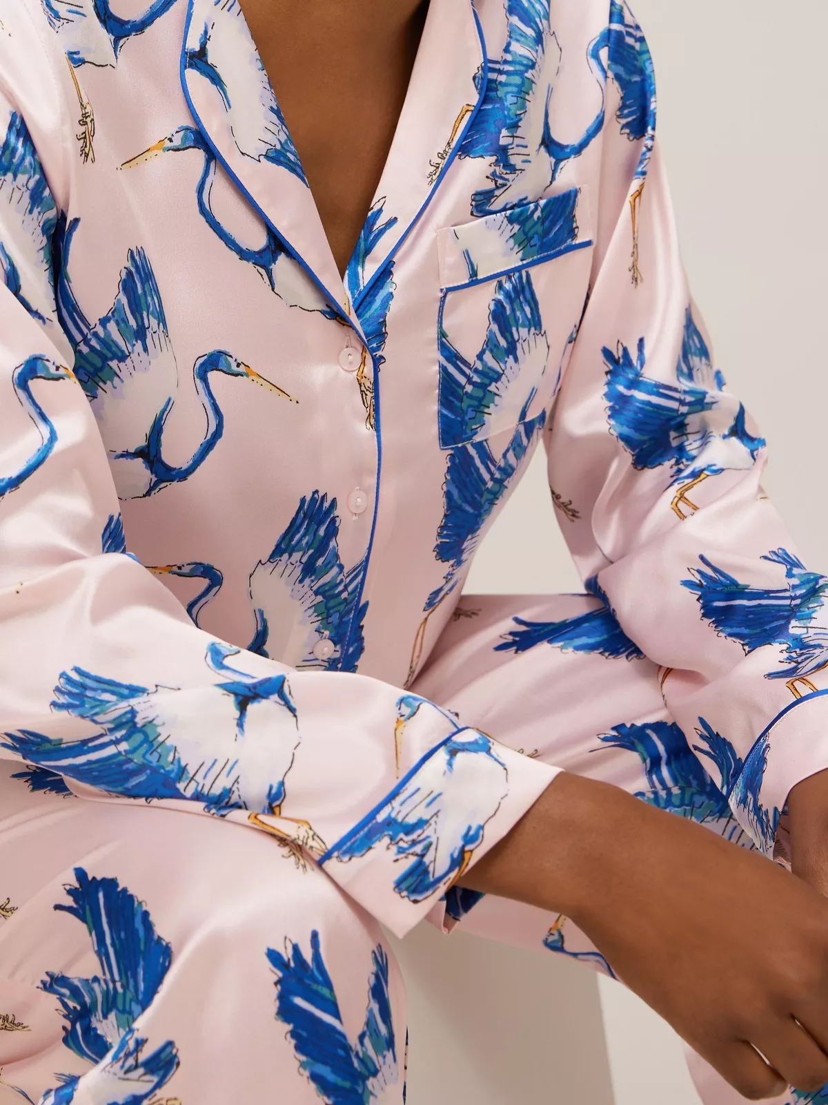 Sleek and stylish satin pyjama set with a stunning blue heron design for a luxurious sleep.