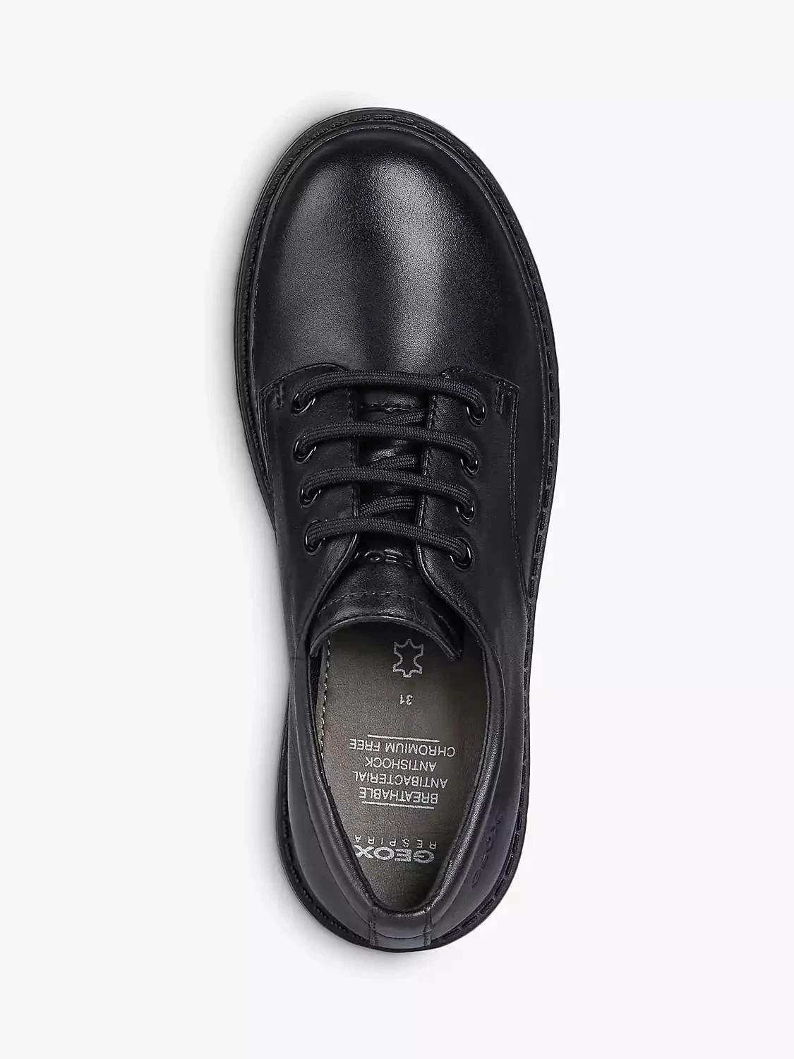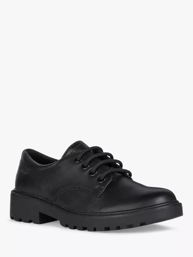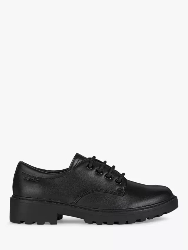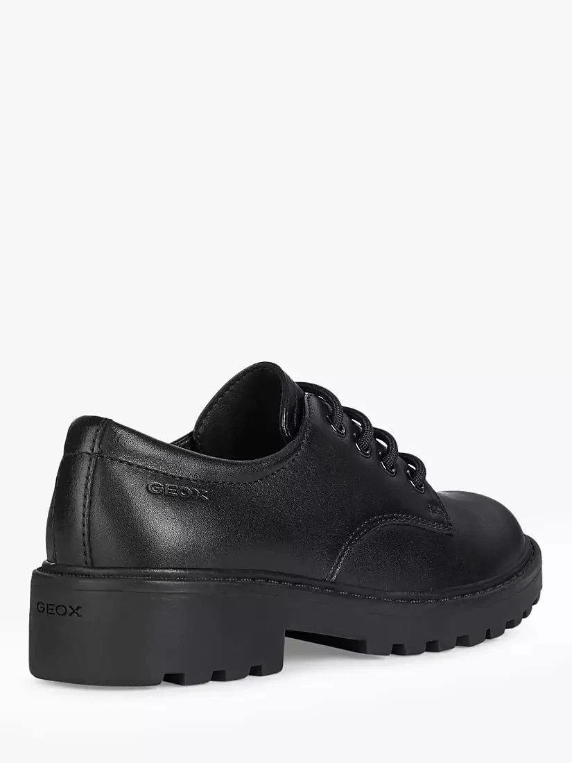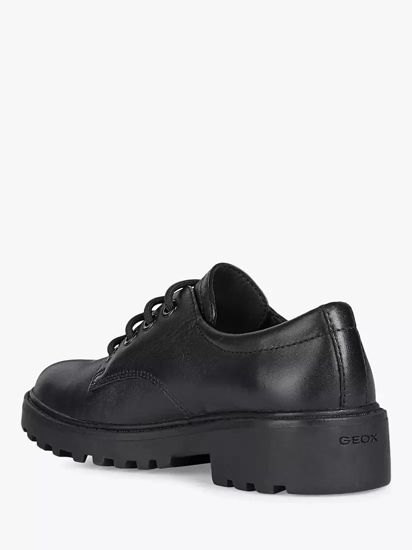 The Geox Casey Leather Derby Shoes in black bring elegance and comfort to school and formal occasions. Crafted from smooth leather, they feature a traditional lace-up design for a secure fit and a breathable sole to keep feet fresh. With a cushioned insole and durable outsole, these shoes offer dependable wear for any day that calls for polished style.