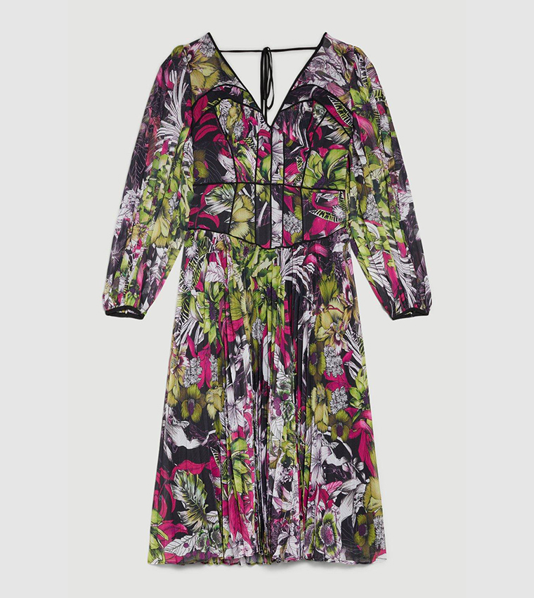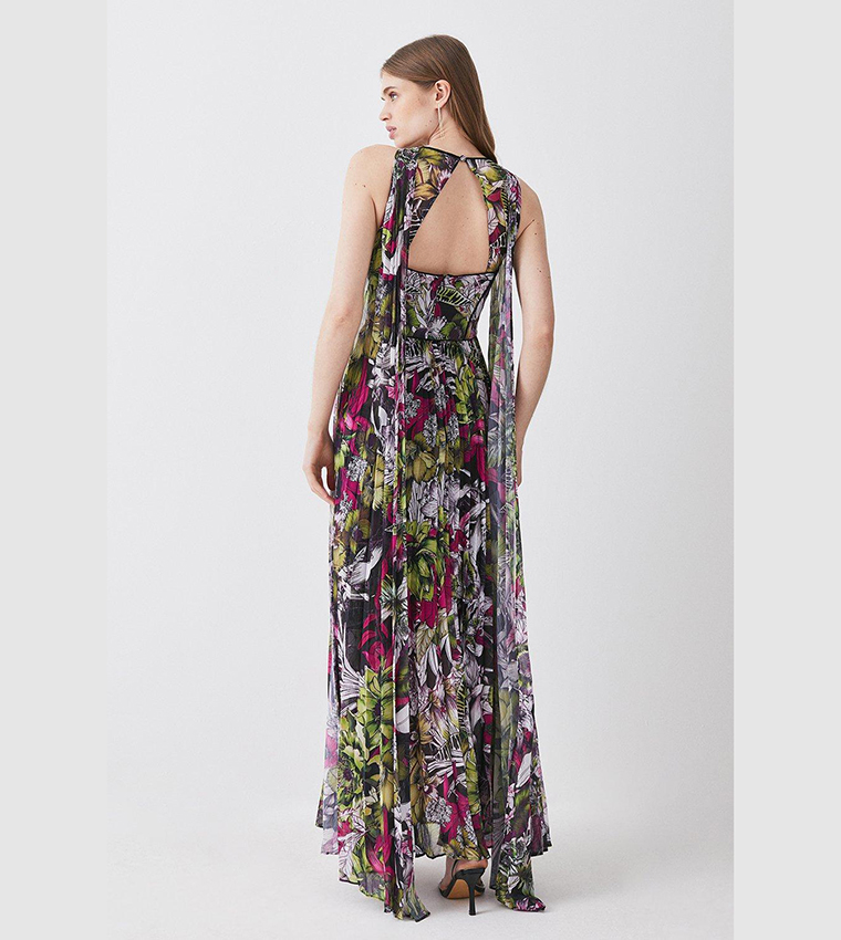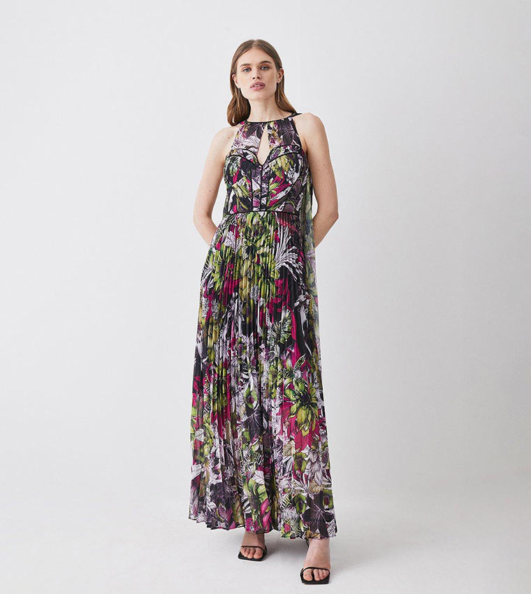 This elegant maxi dress features a corset design, floral print, and pleated skirt for a feminine, flattering look. Crafted from high-quality woven fabric, it’s perfect for formal events and special occasions.
