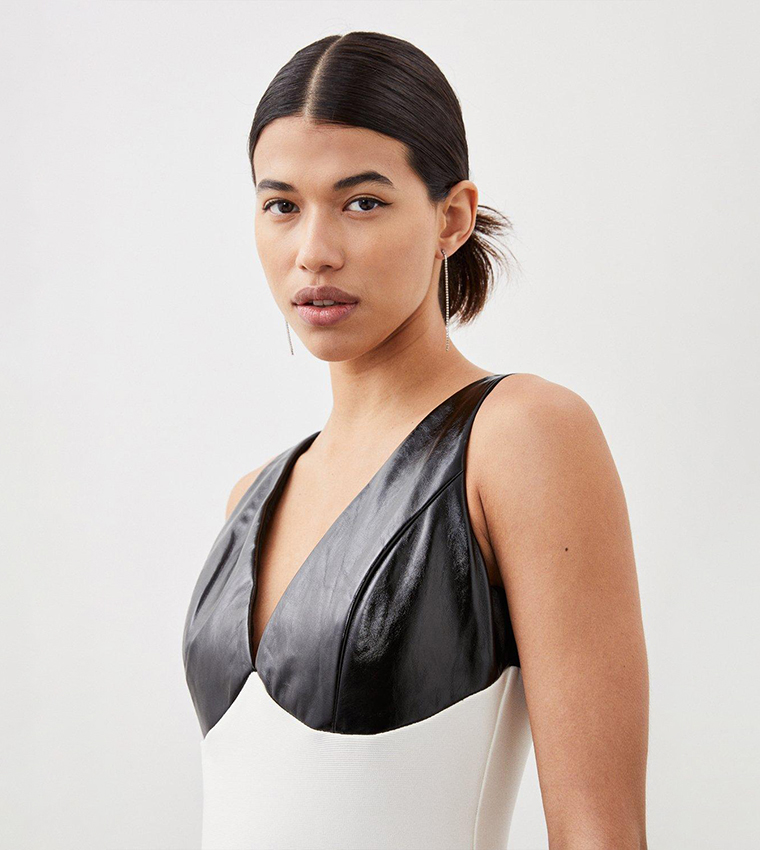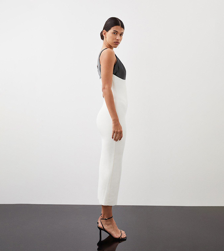 Show off your curves in the Figure Form Bandage Contrast Knit Midi Dress. Featuring a unique knit pattern and flattering bandage fit, this dress is a bold choice for any occasion.