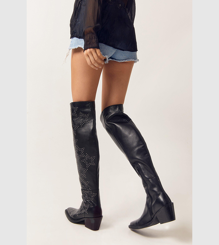 Ride into style with the Leather Star Studded Over-the-Knee Cowboy Boots. It combines classic cowboy design with star-studded accents for a bold look.