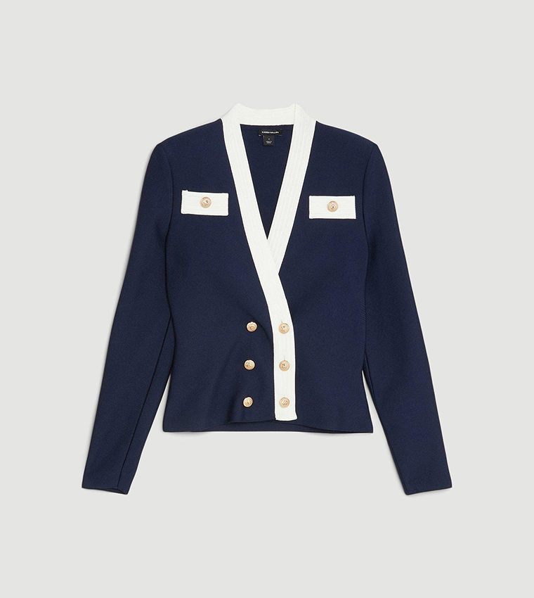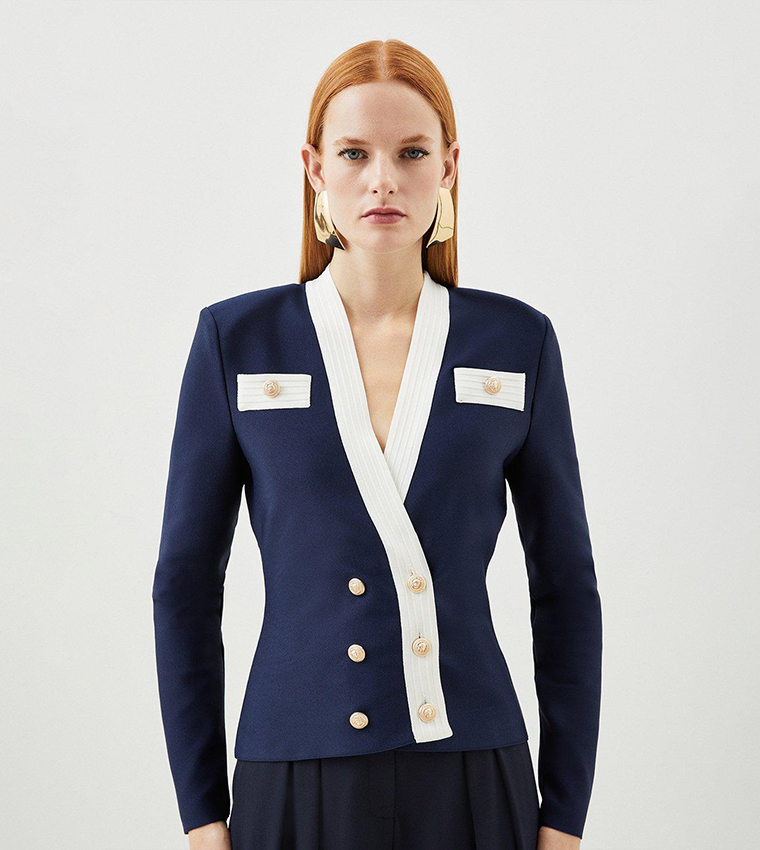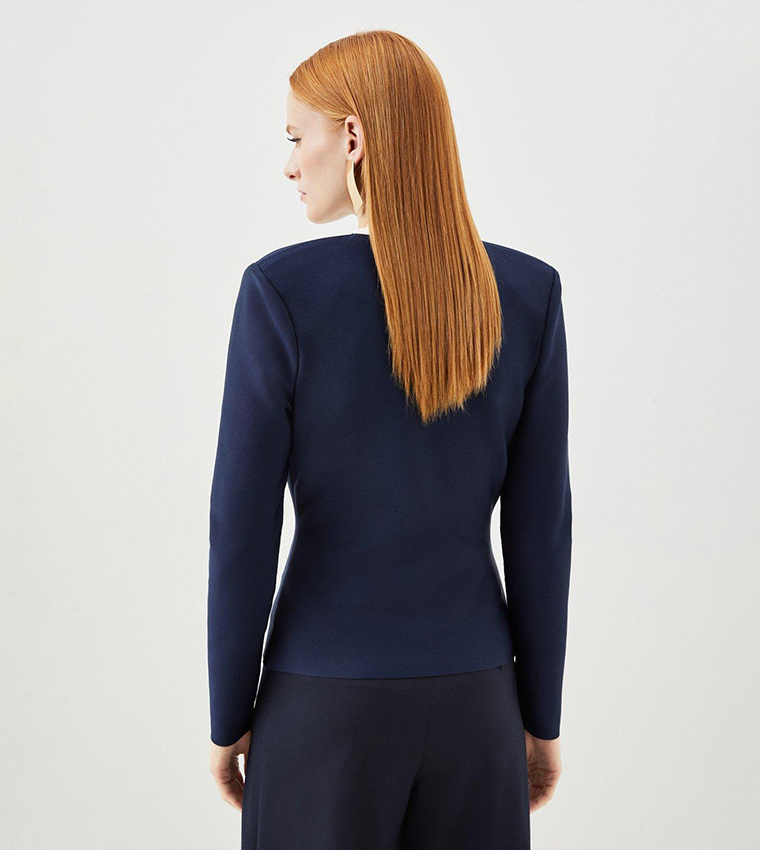 Elevate your outerwear collection with the Military Trim Bandage Knit Jacket. Its structured design and stylish military trims make it perfect for polished looks.