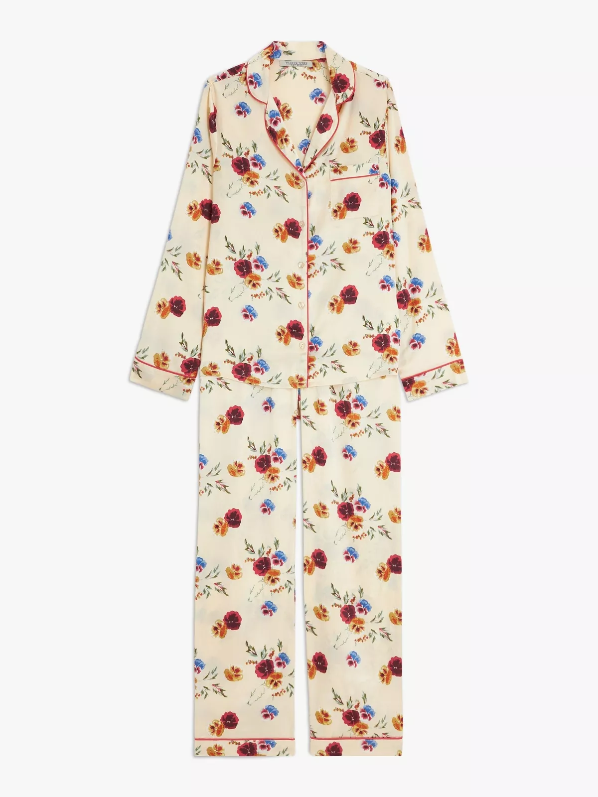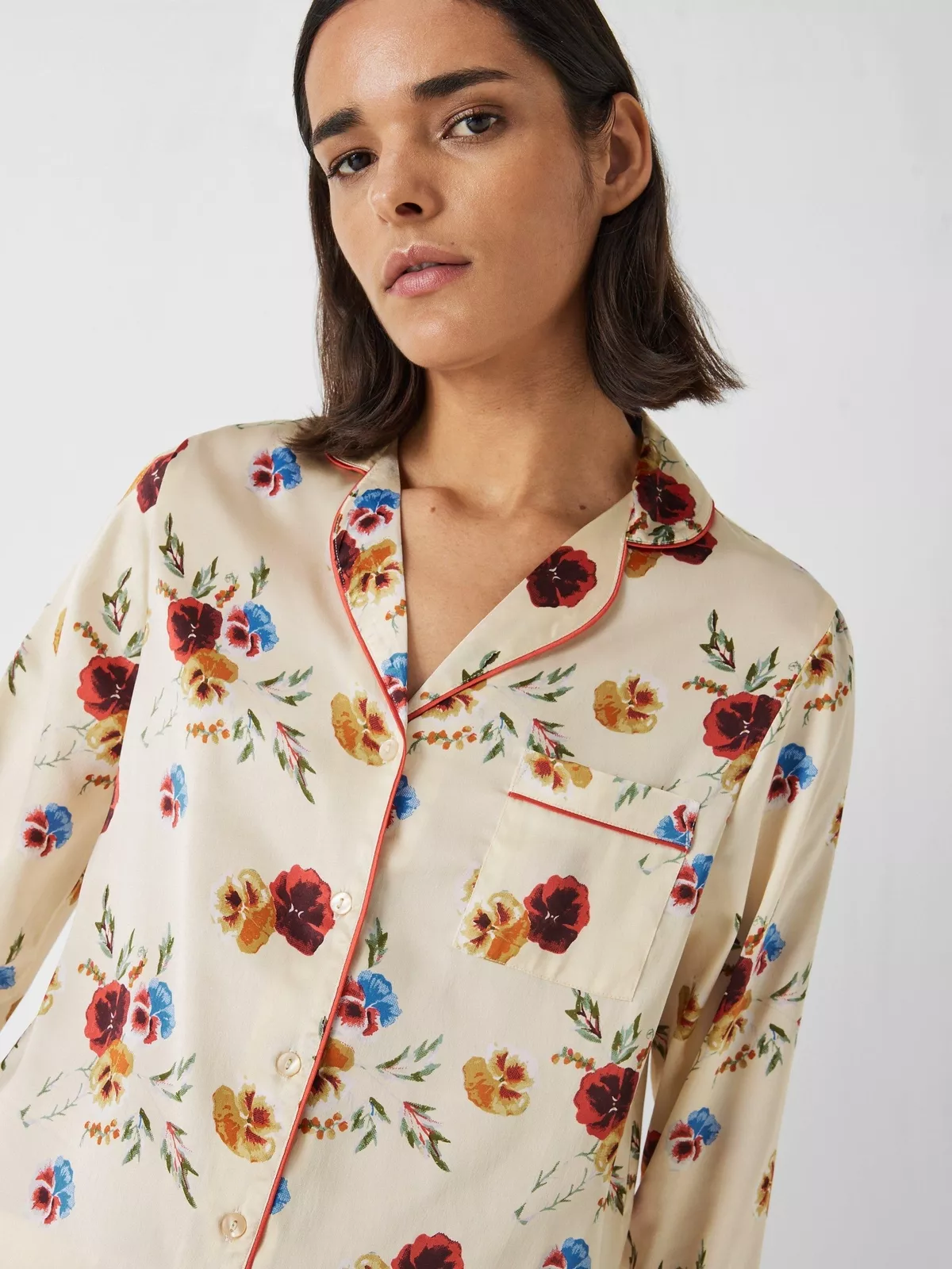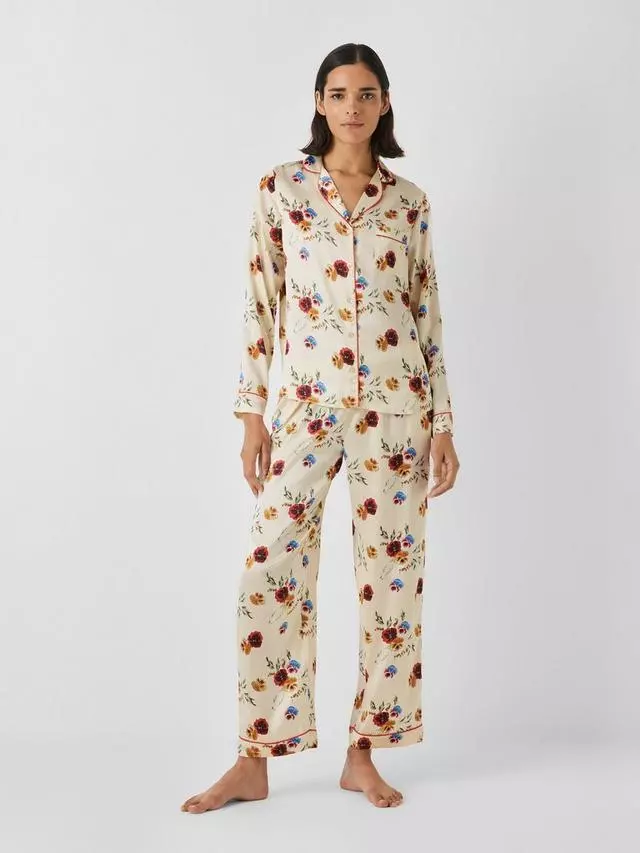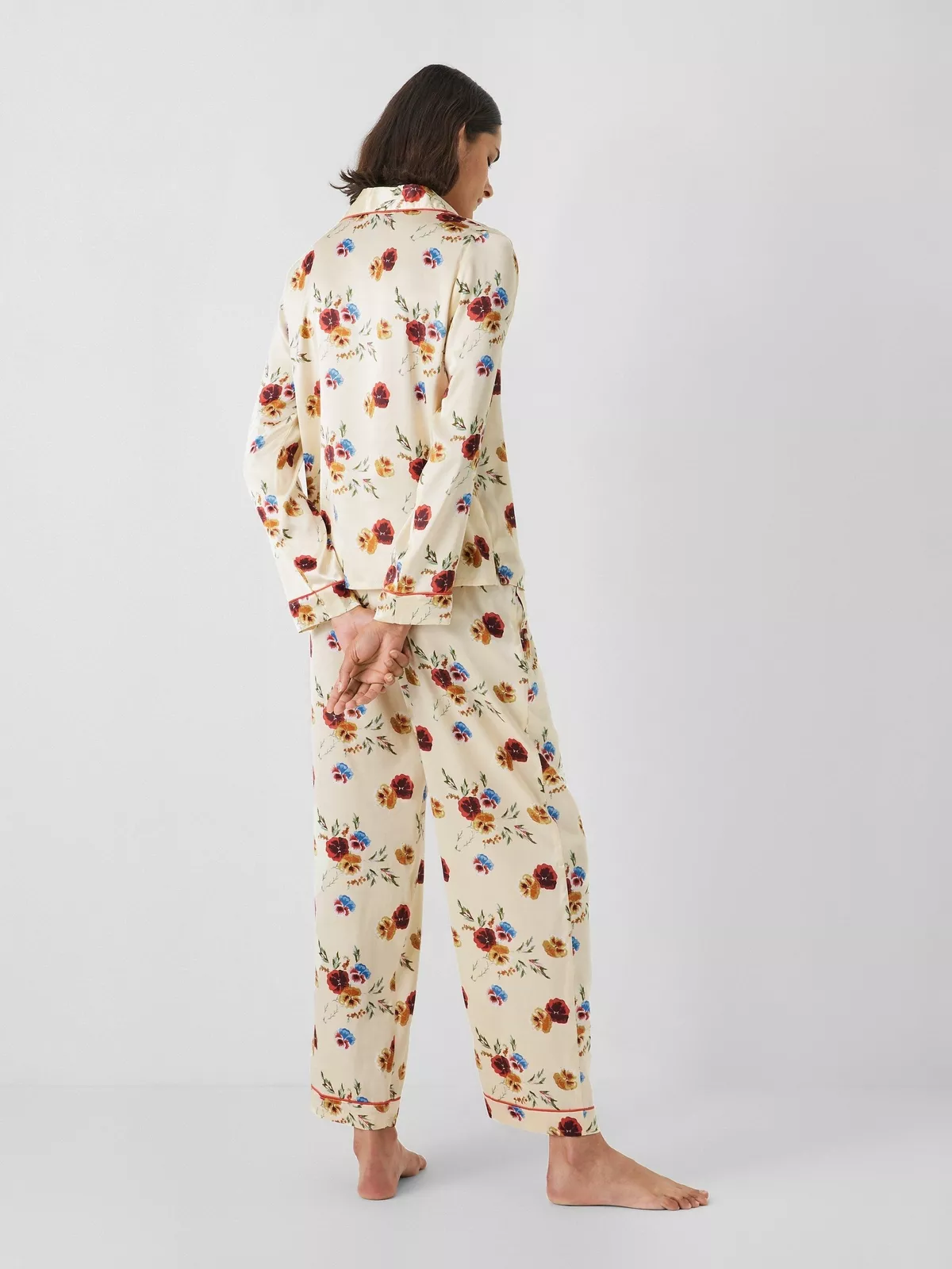 The Pansies Print Satin Pyjama Set features a delicate pansy floral design on luxurious, silky satin fabric. It includes a button-up shirt with a notched collar and matching elastic-waist trousers for a stylish and comfortable sleepwear look.