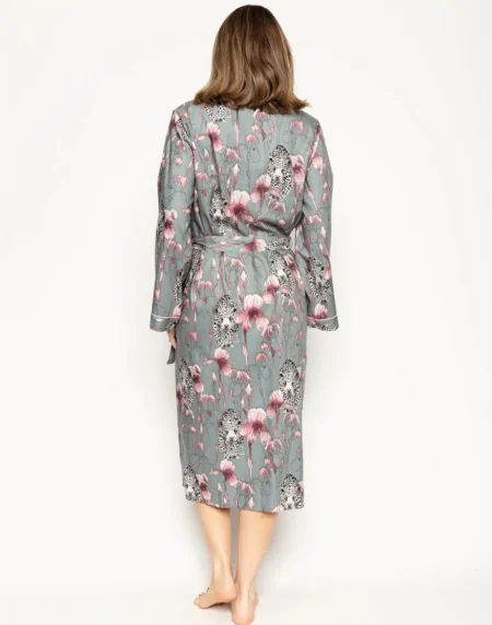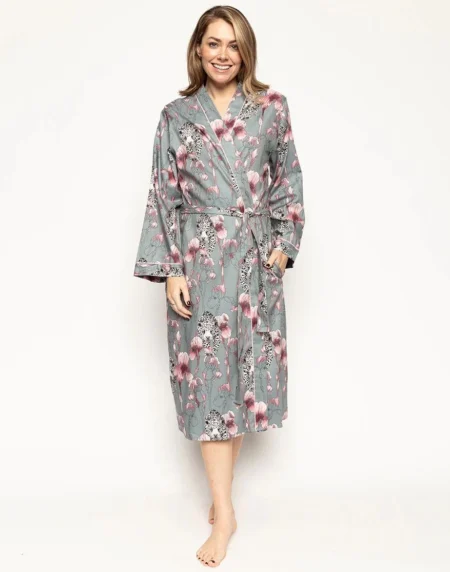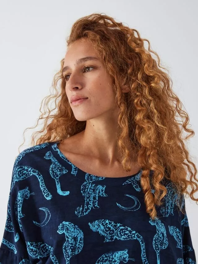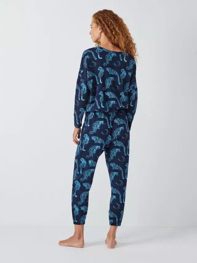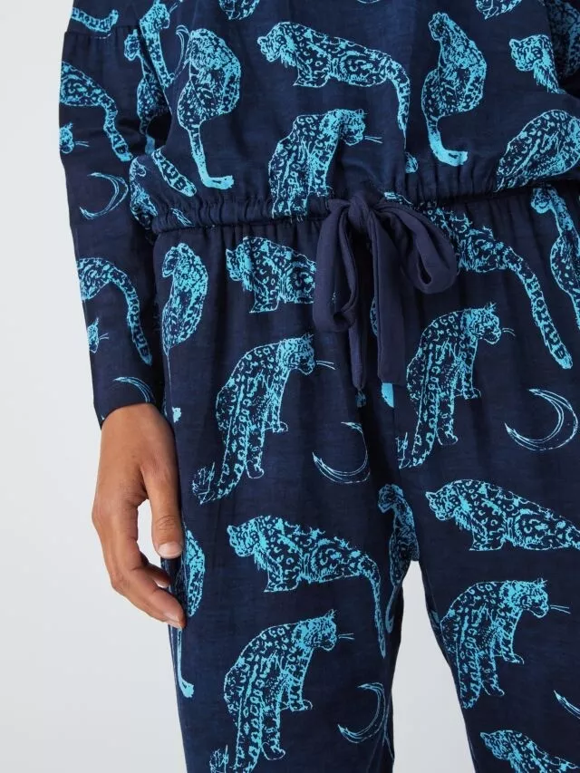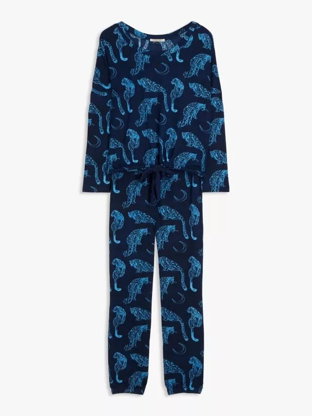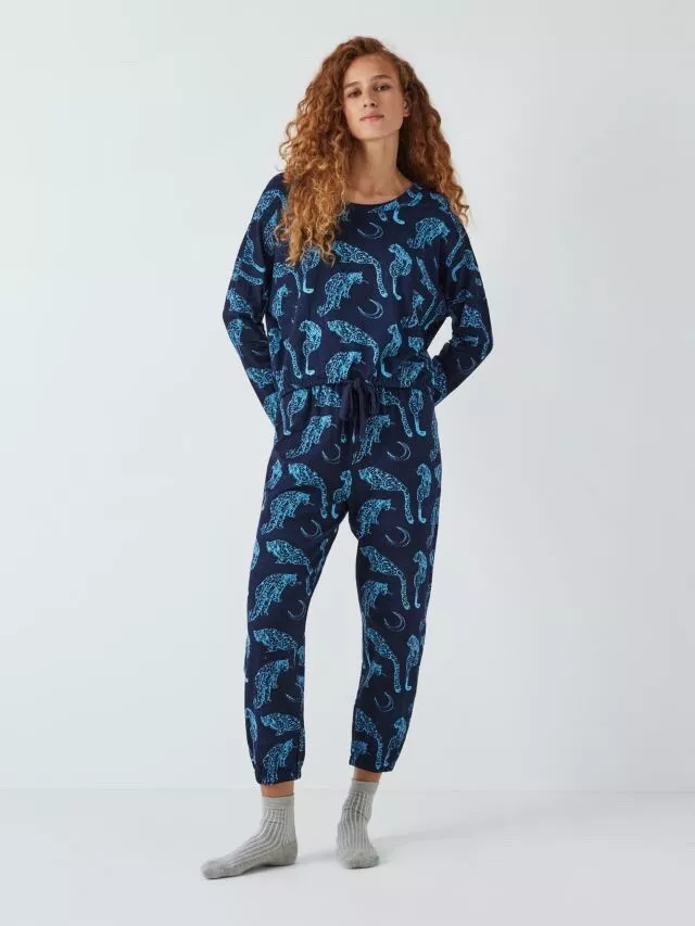 The Snow Leopard Moon Print Jersey Pyjama Set features a stylish snow leopard and moon design. With a soft, stretchy jersey fabric. It includes a long-sleeve top and matching trousers with an elastic waistband. It offers comfort and a chic, cozy look for a restful night’s sleep.