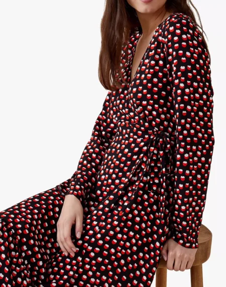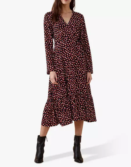 Stylish and flattering, this midi dress features a timeless wrap design and playful spot print, perfect for everything from work to weekend outings.