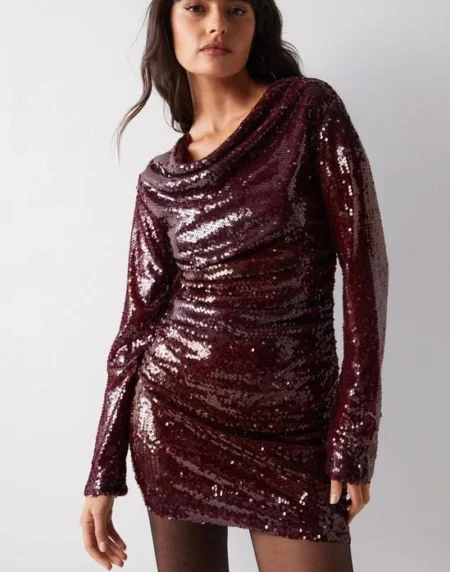 Long sleeve dress with cowl neckline and elegant sequin sparkle.